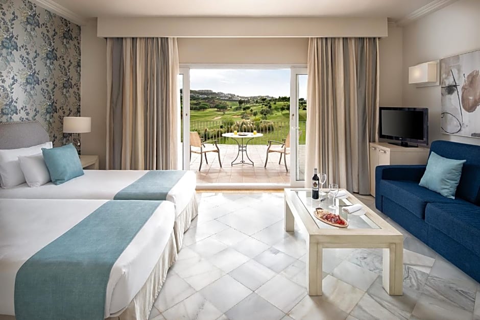 This spacious room has a balcony with views over the golf course, satellite TV and air conditioning. It includes a seating area with a sofa bed. Please note the children must be 12 years or younger.